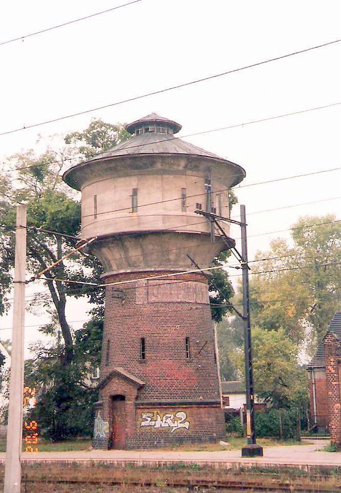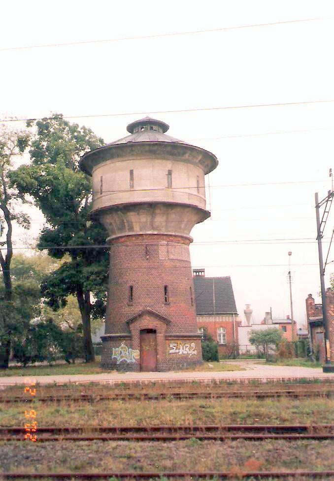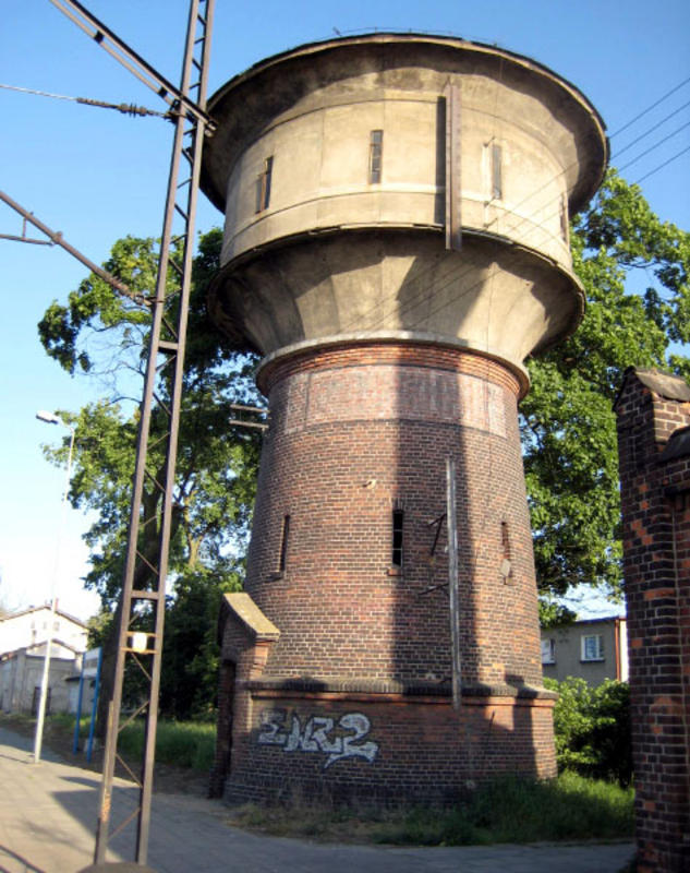 Wyrzysk Osiek. Kolejowa wieża wodna. Widok od strony peronów, w kierunku północnym; w lewo dworzec, w prawo Nakło nad Notecią/Bydgoszcz.