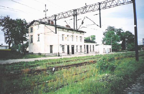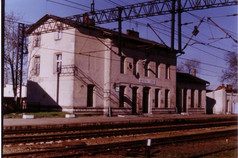Dworzec kolejowy od strony peronów. Z lewej kolejowy budynek mieszkalny. Widok w kierunku północno-zachodnim; od strony Nakła nad Notecią/Bydgoszczy.