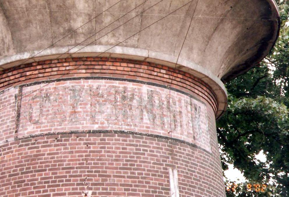 Wyrzysk Osiek. Podwójna nazwa Wyrzysk Osiek na trzonie wieży wodnej.