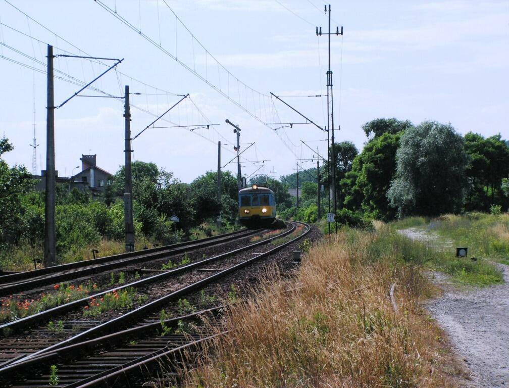 EN57-1794 jako poc. Os 85428 Piła Gł. - Bydgoszcz Gł. Widoczna bocznica, prowadząca do wytwórni ceramiki - obecnie całkowicie rozebrana, nie ma po niej śladu. Widok w kierunku zachodnim (Piła - w tle semafor wjazdowy z tego kierunku).