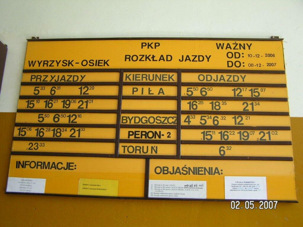 Tablica z rozkładem jazdy 2006/2007 (obowiązujący do 31 maja 2007 r., jeszcze bez postojów poc. pospiesznych) wisząca w budynku dworcowym.