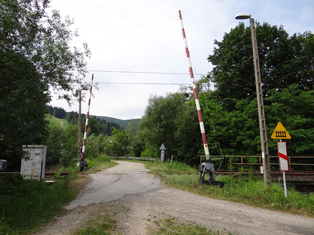 Przejazd drogowy w ciągu polnej drogi przy ulicy Katowickiej. Po prawej jednoprzęsłowy most nad Potokiem Suchym. W prawo Skoczów, w lewo Wisła. 9,4 km.