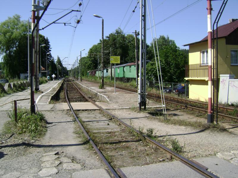 Dwa perony boczne. Po lewej dojście do stacji. Wiadukt pod ulicą Katowicką. Po lewej parking na ok. 60 miejsc. W oddali po lewej nastawnia UP. Widoczne obydwa semafory wyjazdowe. Widok w kierunku Skoczowa. 9,5 km.