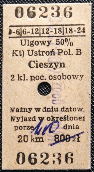 Bilet kartonikowy wydany na stacji Ustroń Polana.