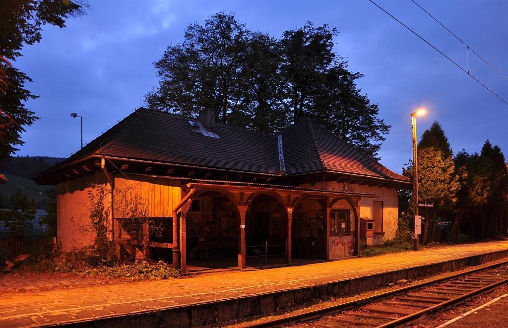 Widok na peron i budynek dworca w kierunku północno-zachodnim (Ustroń/Goleszów).