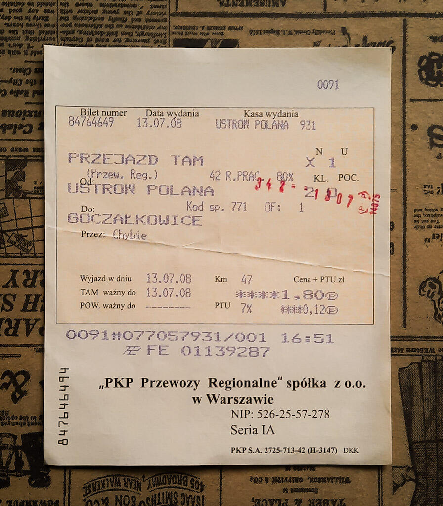 Bilet blankietowy wydany na stacji Ustroń Polana.