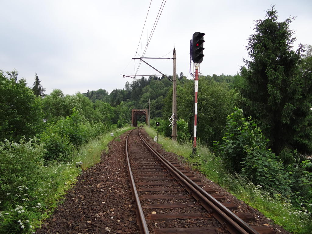 Semafor wjazdowy stacji Wisła Uzdrowisko od strony Ustronia. Łuk o promieniu ok. 290 m. Jednoprzęsłowy most nad Wisłą. Widok w kierunku końca linii, Wisły Głębce. 13,9 km.