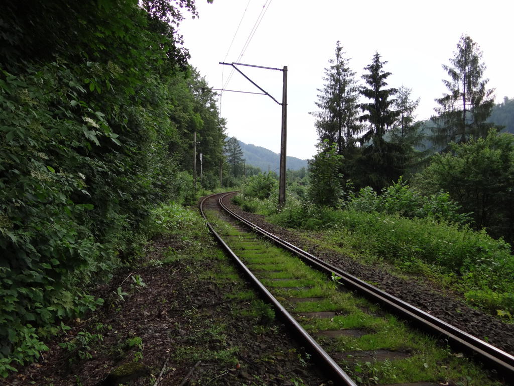 Widoczna północna głowica rozjazdowa; wyjazd na Ustroń. Łuk o promieniu ok. 270 m. Widok w kierunku końca linii, Wisły Głębce. 14,3 km.