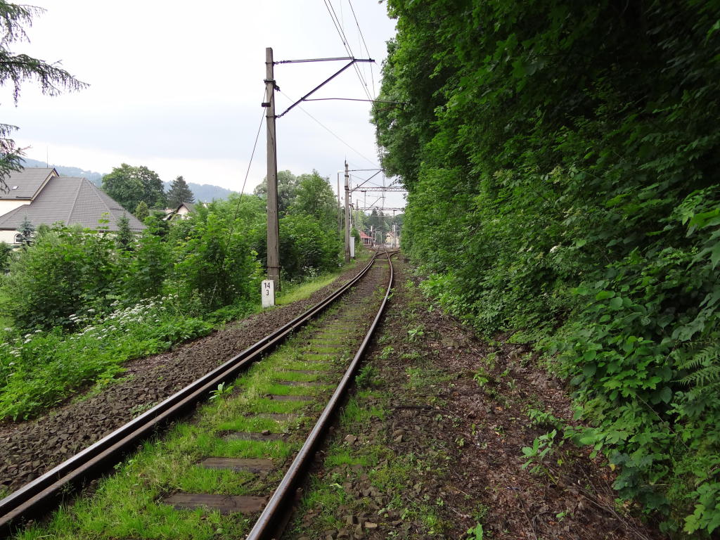 Północna głowica rozjazdowa; wyjazd na Ustroń. W oddali łuk o promieniu ok. 270 m. Widok w kierunku Ustronia. 14,4 km.