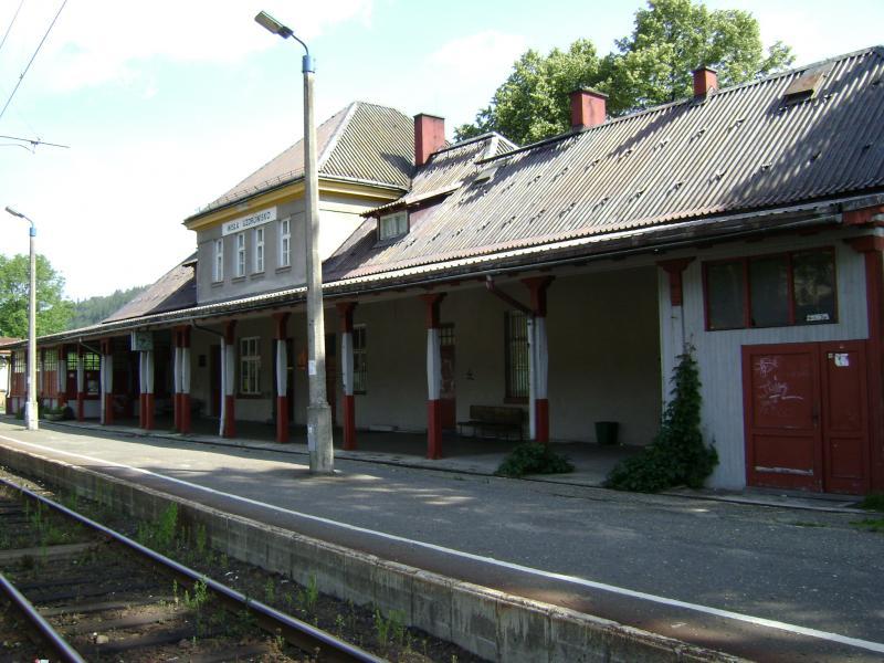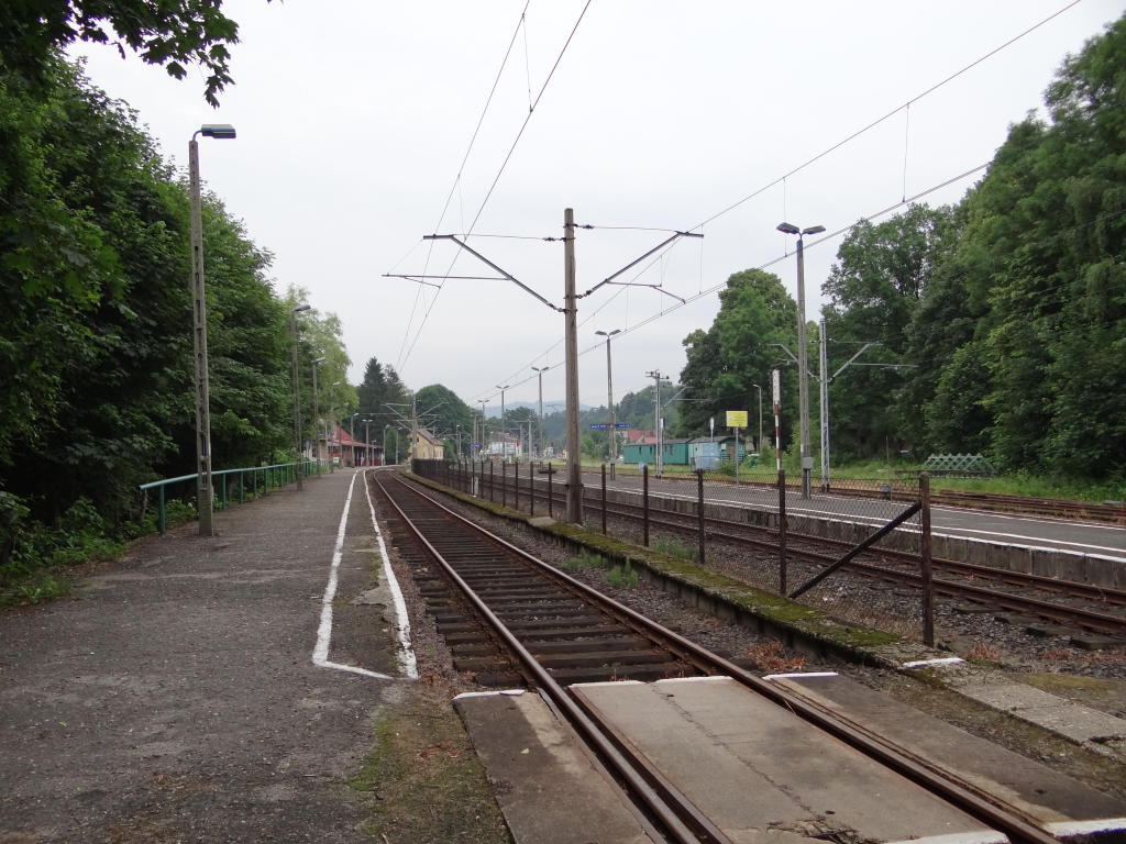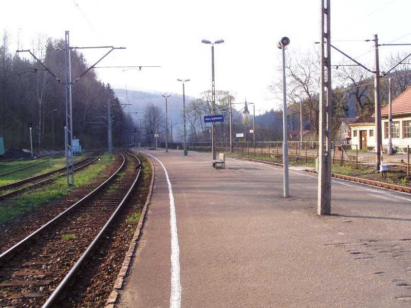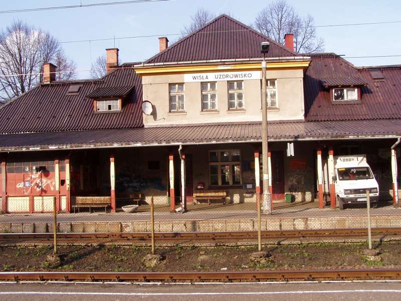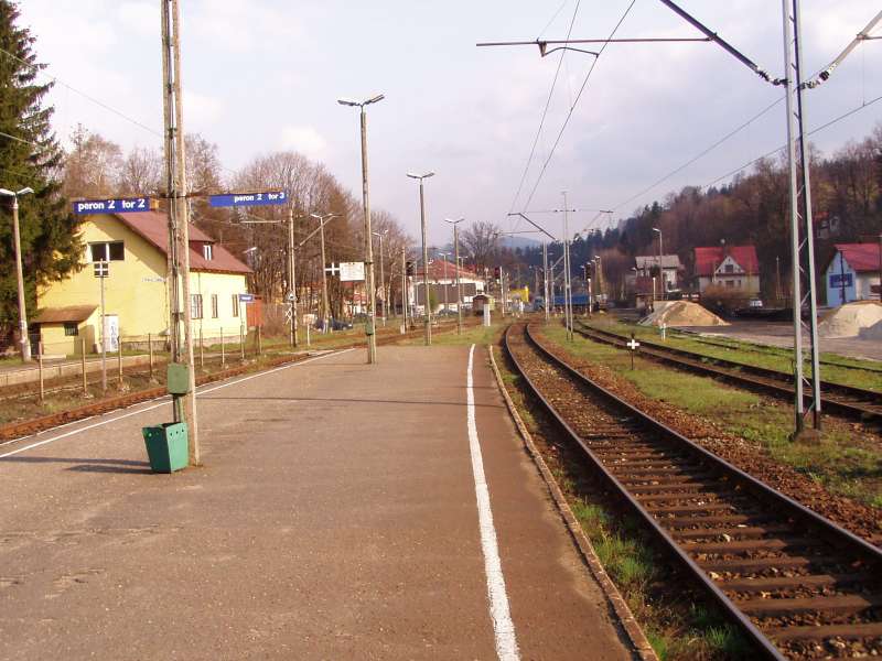 Od lewej peron pierwszy, boczny i drugi, wyspowy. Po lewej widoczny budynek dworcowy od strony peronów. Po prawej urządzenie do elektrycznego ogrzewania wagonów osobowych. Widok w kierunku końca linii, Wisły Głębce. 14,4 km.