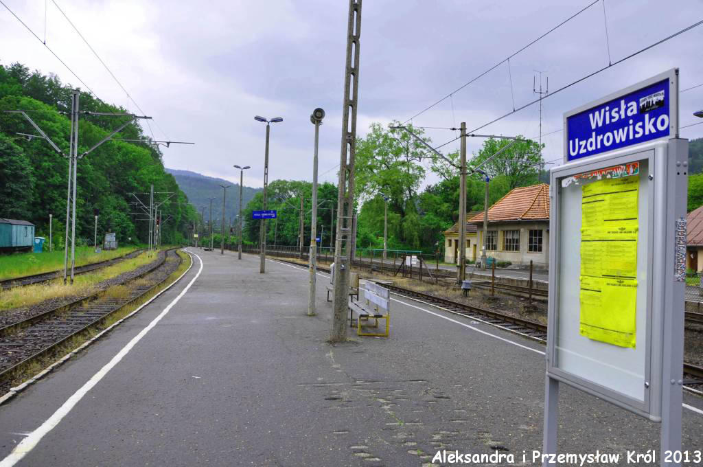 Północna głowica rozjazdowa; wyjazd na Ustroń. Widoczne od lewej peron pierwszy, boczny i drugi, wyspowy. Po lewej widoczny budynek dworcowy od strony peronów. Widok w kierunku końca linii, Wisły Głębce. 14,3 km.