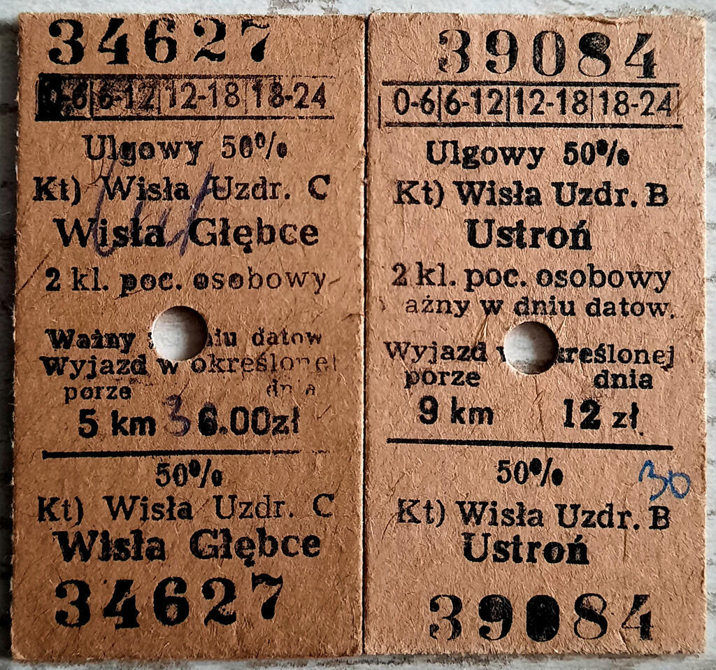 Bilety kartonikowe wydane na stacji Wisła Uzdrowisko.