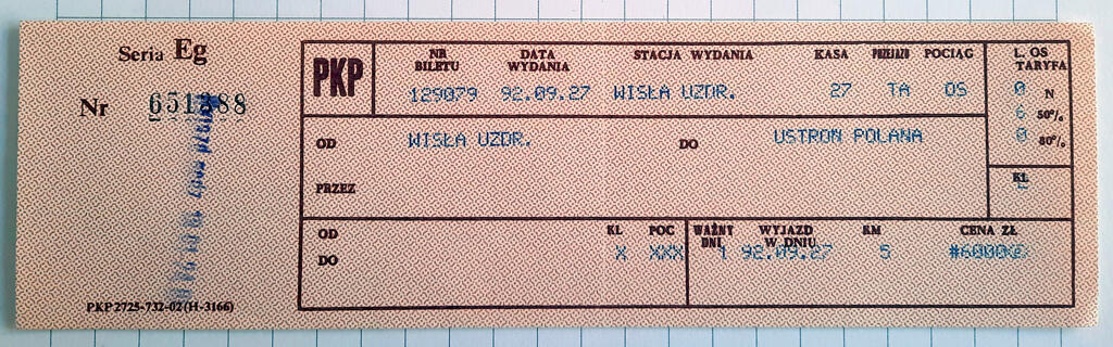 Bilet blankietowy wydany na stacji Wisła Uzdrowisko.