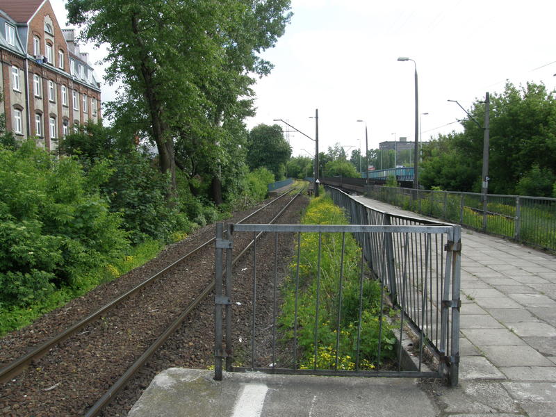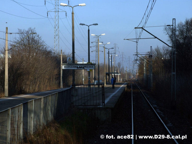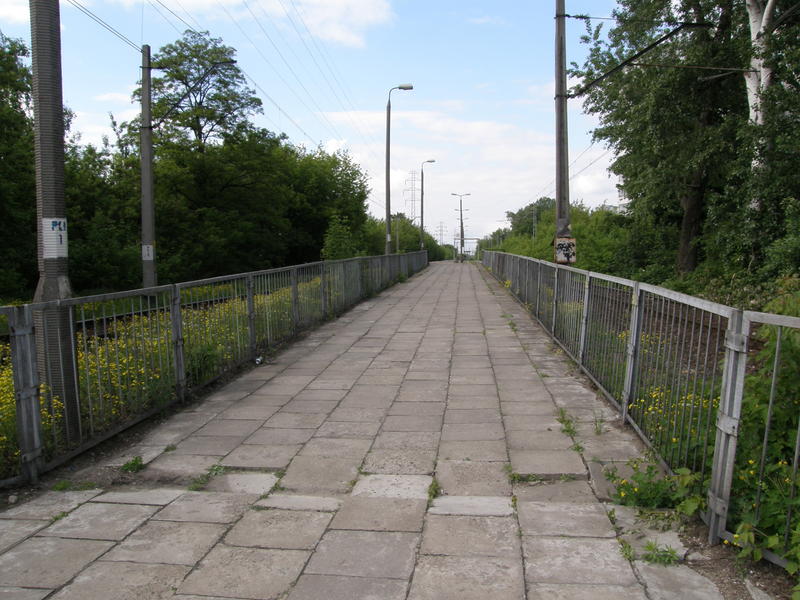 Widok w kierunku Warszawy Gdańskiej. Wejście na peron przystanku Warszawa Kasprzaka od strony ulicy Wolskiej.