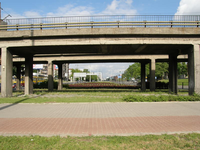 Wiadukt nad ulicą Kasprzaka. W lewo Warszawa Gdańska, w prawo Warszawa Wola. Pod środkowym szerokim przęsłem była linia tramwajowa.