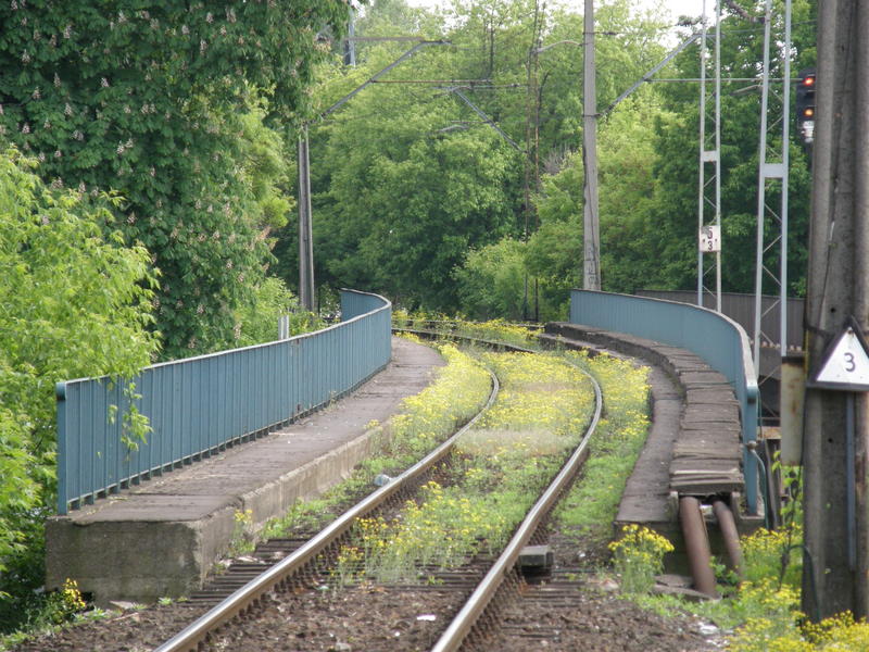 Wiadukt nad ulicą Kasprzaka. Tor nr 1. Widok w kierunku Warszawy Woli. Widoczny semafor powtarzający odnoszący się do semafora wjazdowego stacji Warszawa Zachodnia. Zdjęcie z peronu przystanku Warszawa Kasprzaka.