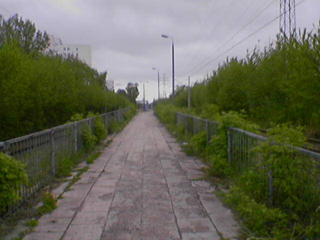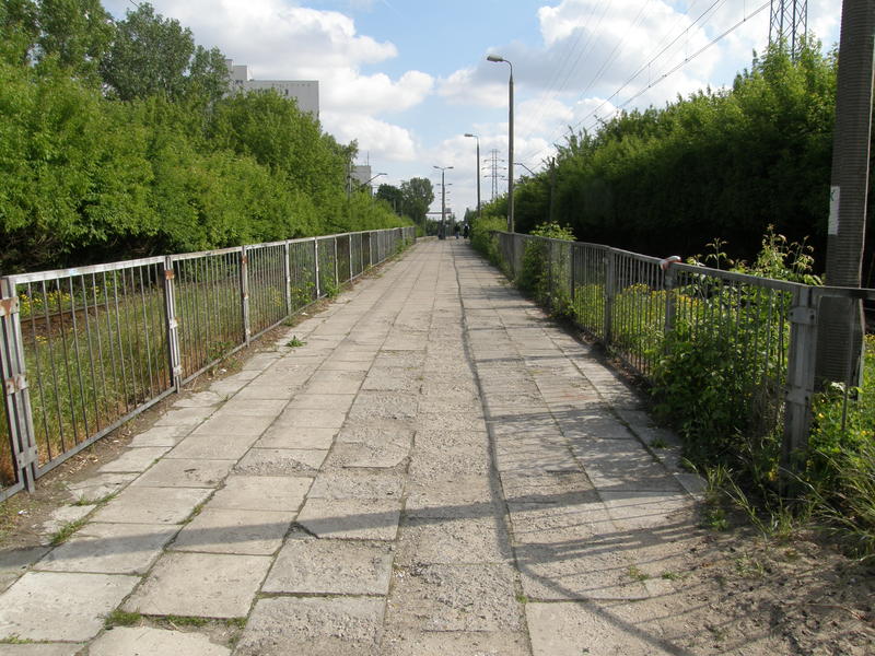 Widok w kierunku Warszawy Gdańskiej. Wejście na peron przystanku Warszawa Kasprzaka od strony ulicy Kasprzaka.