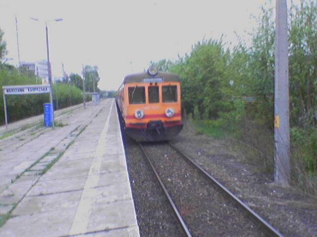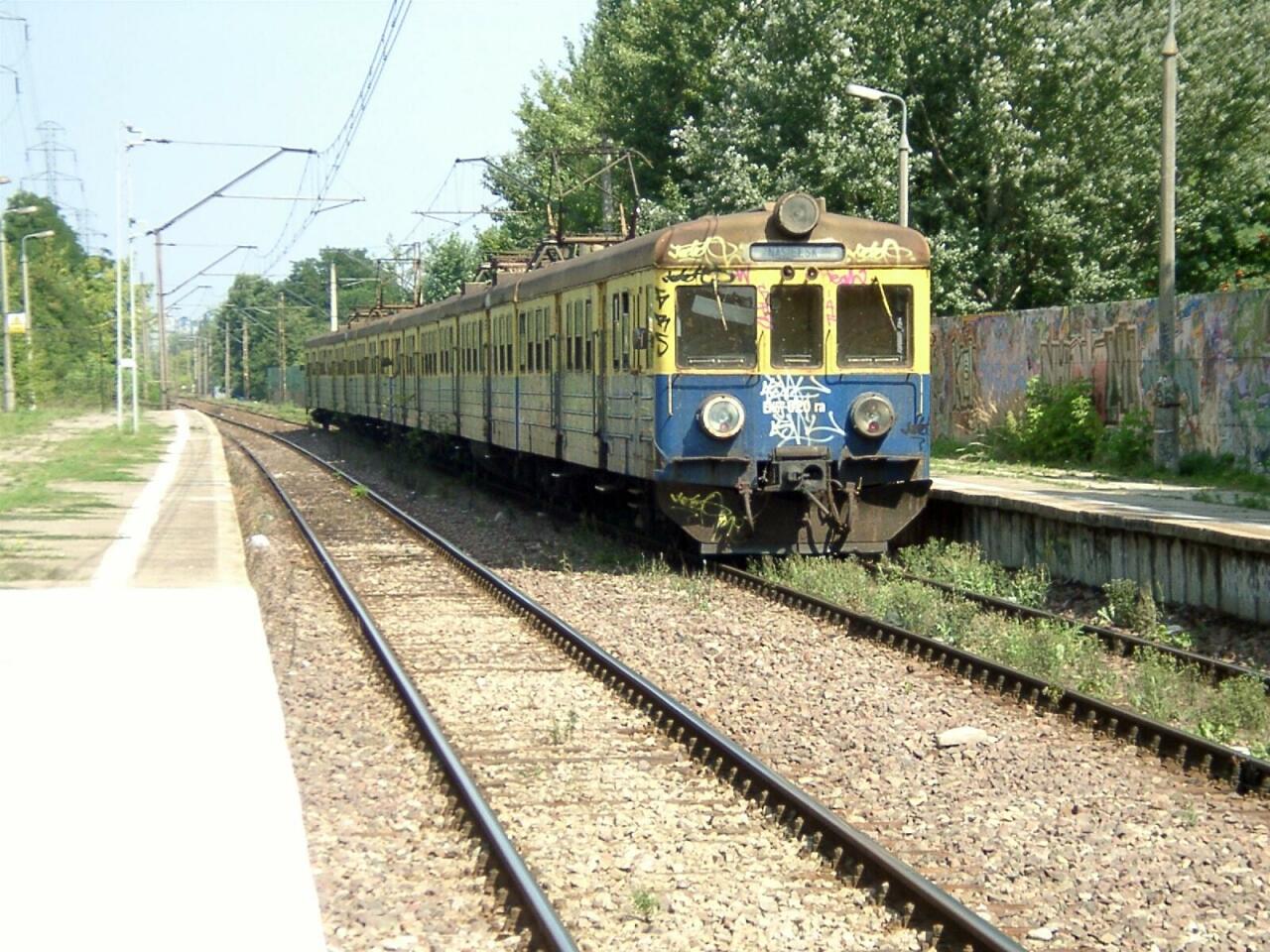 Elektryczny zespół trakcyjny EN-57 wjeżdża na tor drugi przy peronie przystanku Warszawa Kasprzaka w kierunku przystanku Warszawa Wola.