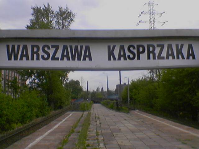 Jeden z dwóch dumnych napisów Warszawa Kasprzaka. Ten akurat znajduje się przy wejściu od strony ulicy Kasprzaka. Zdjęcie przedstawia obraz w kierunku przystanku Warszawa Wola. Niegdyś tło było niebieskie a napisy białe.