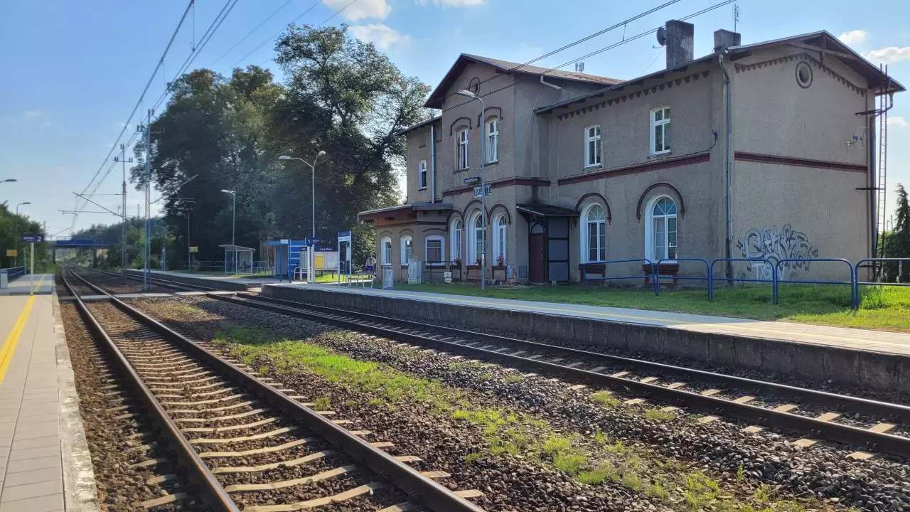 Widok z peronu 1 w kierunku Kostrzyna, Wrocławia. Budynek dworcowy widoczny od strony torów.