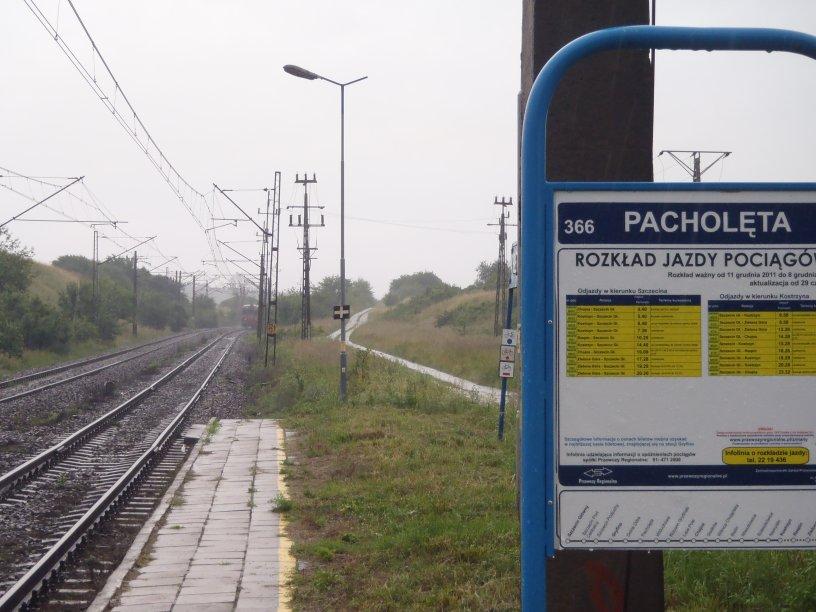 Pacholęta - widok w kierunku Widuchowej, widoczny odjeżdżający typowy dla tej linii EN57-kibel, dalej na prawo: droga brukowa i typowy dla woj. zachodniopomorskiego tablicowy rozkład jazdy;