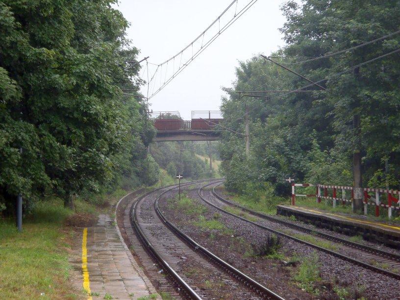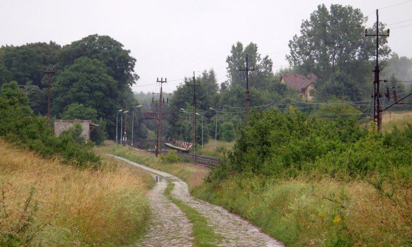 Pacholęta - widok w kierunku Dolnej Odry, po prawej peron o fundamentach drewnianych a powierzchni z płyt betonowych (kiedyś cały drewniany), w oddali widoczny wiadukt;