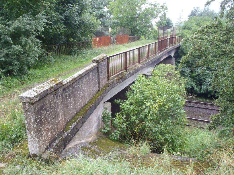 Nad torami wiadukt betonowy poniemiecki w miejscowości Pacholęta (po prawej Dolna Odra, po lewej Widuchowa);