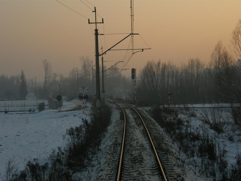 Widok w kierunku Kalwarii Zebrzydowskiej. Pomiędzy przystankiem Rzozów i stacją Radziszów. Semafor wjazdowy stacji Radziszów.