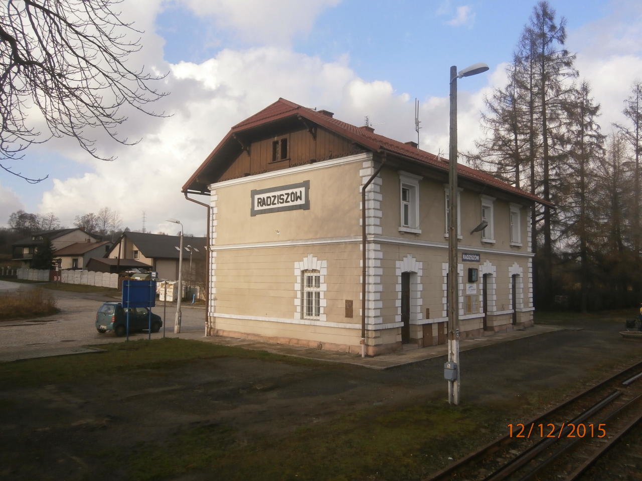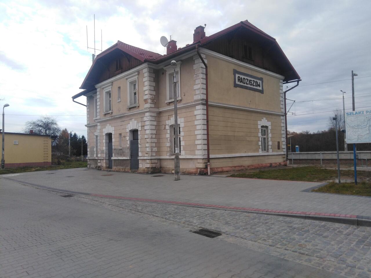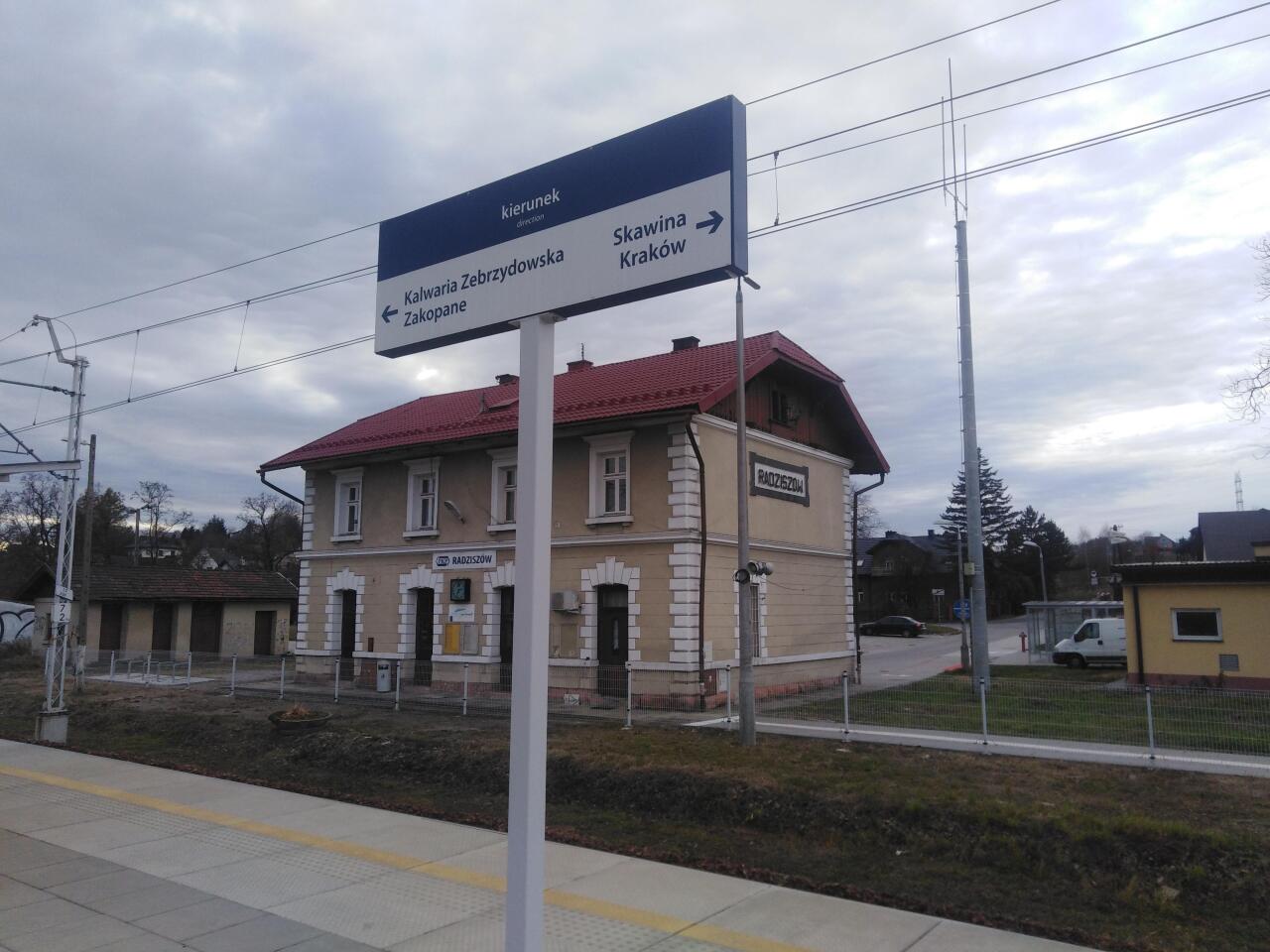 PKP Radziszów. Budynek odremontowany w ramach otwarcia Kolejowego Szlaku Jana Pawła II. Widok od stronu peronu. W prawo Skawina, w lewo Kalwaria Zebrzydowska.
