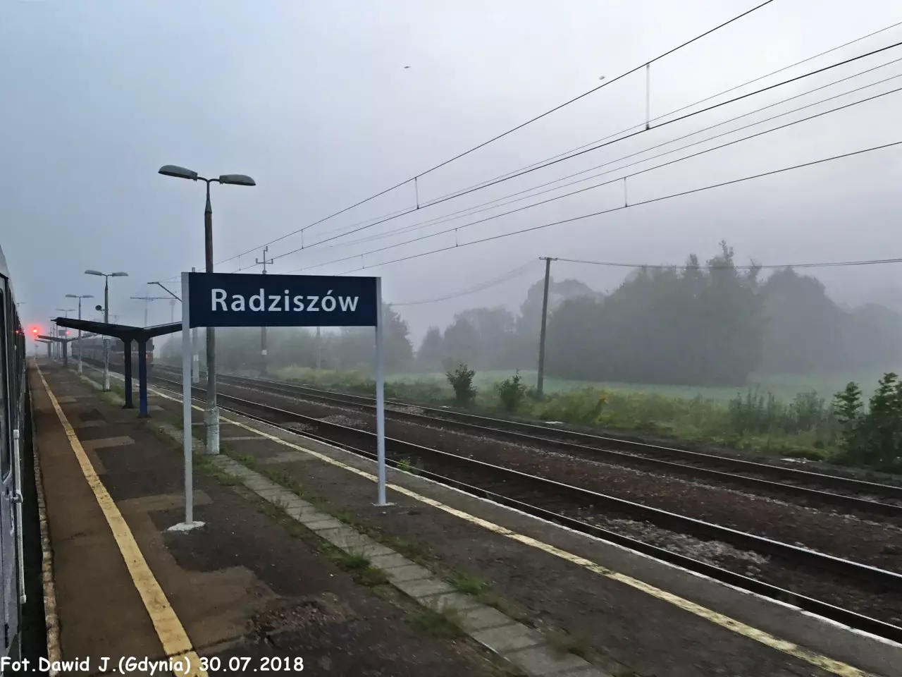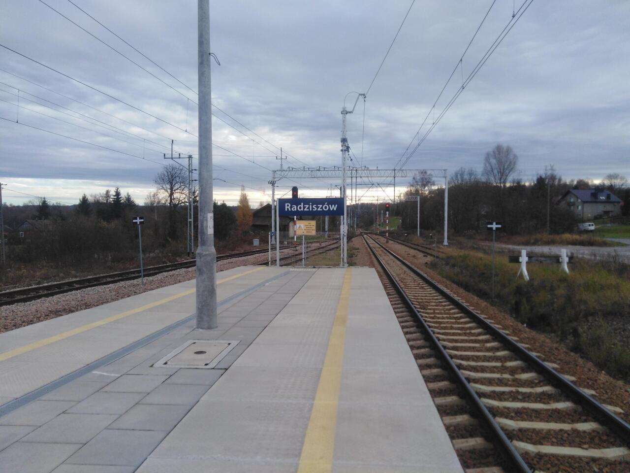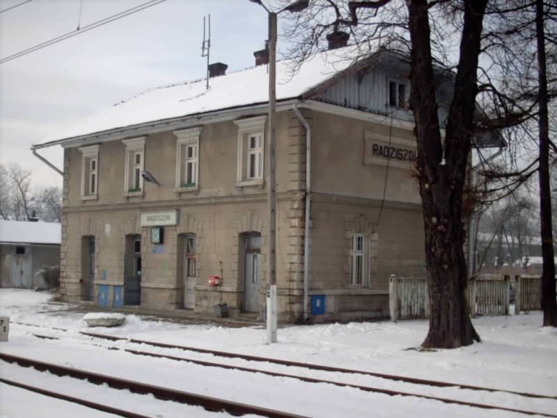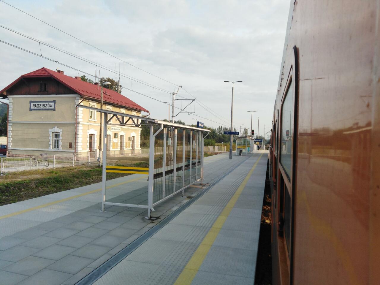 PKP Radziszów. Budynek odremontowany w ramach otwarcia Kolejowego Szlaku Jana Pawła II. Widok od stronu peronu. W prawo Skawina, w lewo Kalwaria Zebrzydowska.