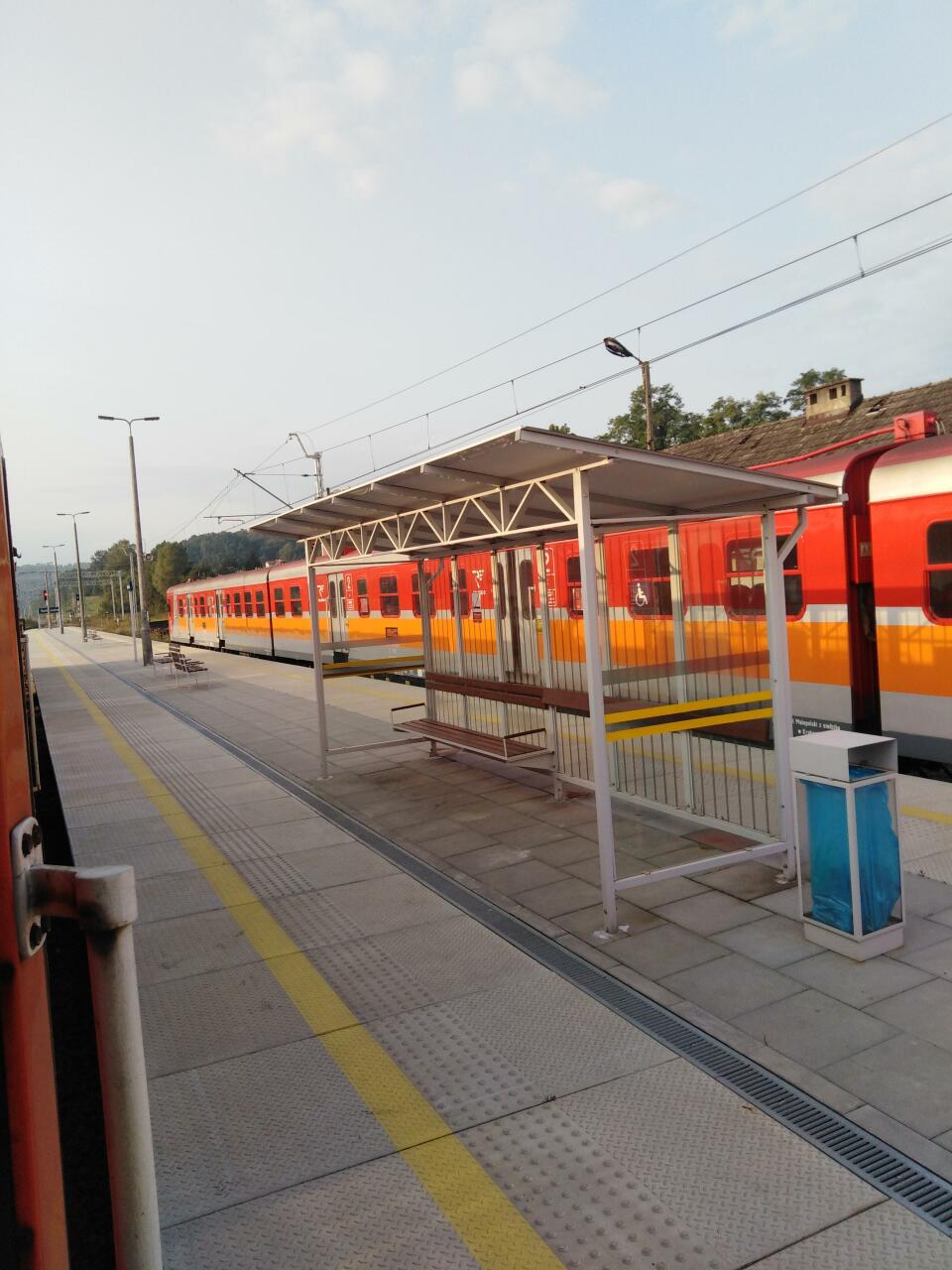 Widok z peronu w kierunku Skawiny/Krakowa Głównego. Peron zmodernizowano. Piękne poranne niebo.