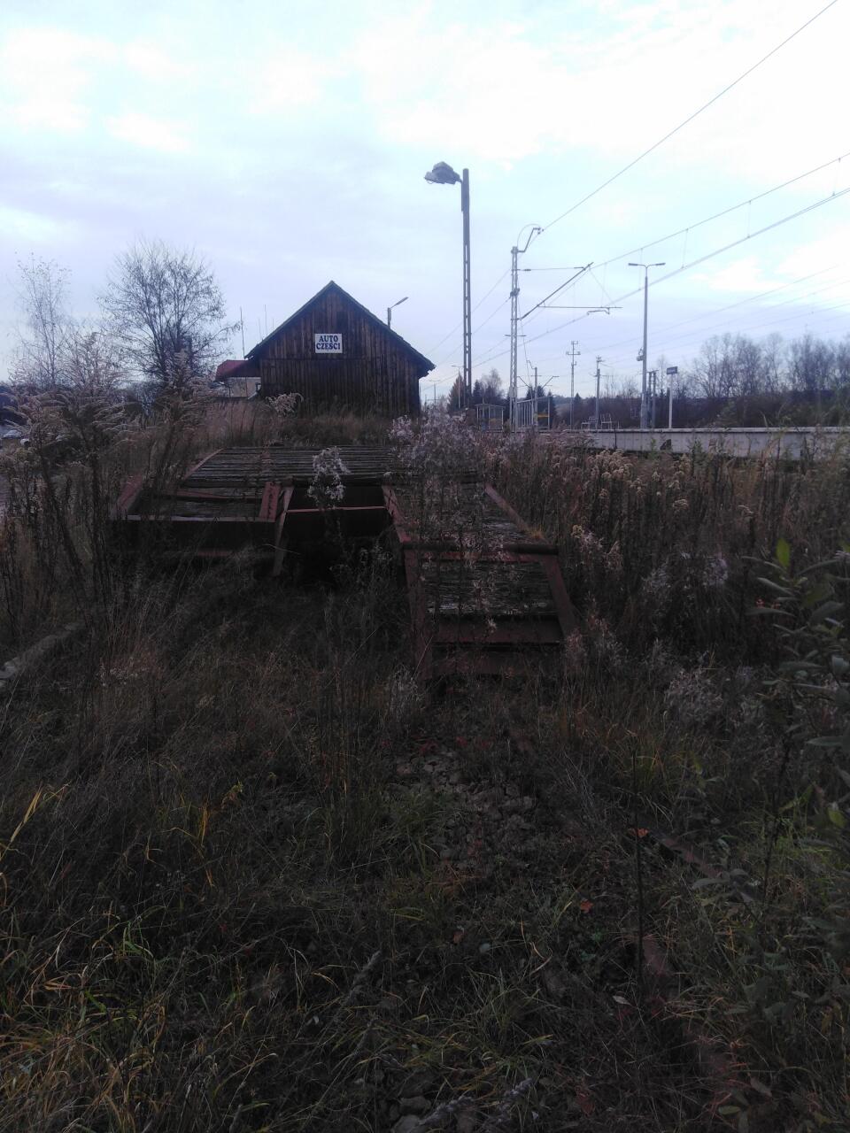 Opuszczony magazyn z resztką rampy. Przy magazynie pozostałość po torze dodatkowym. W lewo Kalwaria Zebrzydowska, w prawo dworzec i dalej Skawina.