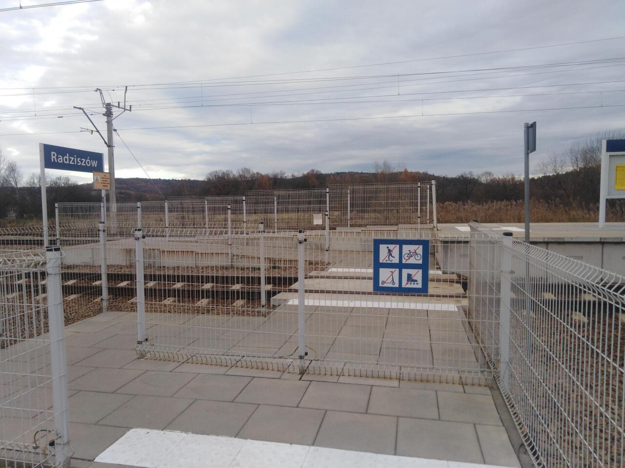 Peron wyspowy w Radziszowie, skromna wiata i nowy peron. Widok od strony Kalwarii Zebrzydowskiej.