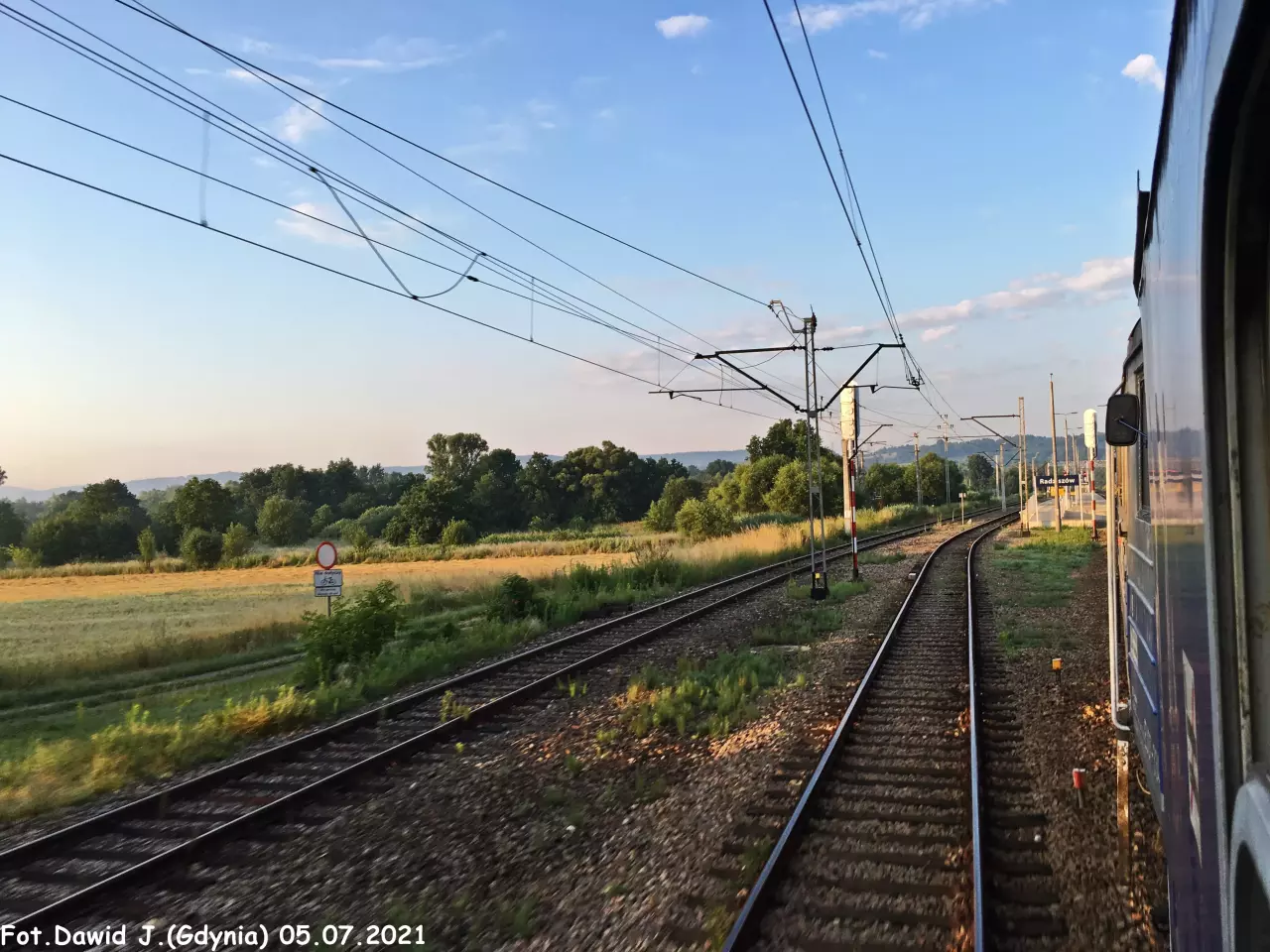 Radziszów. Widok w stronę Kalwarii Zebrzydowskiej. Z prawej Regio udający się do Zakopanego z lewej do Krakowa Głównego.