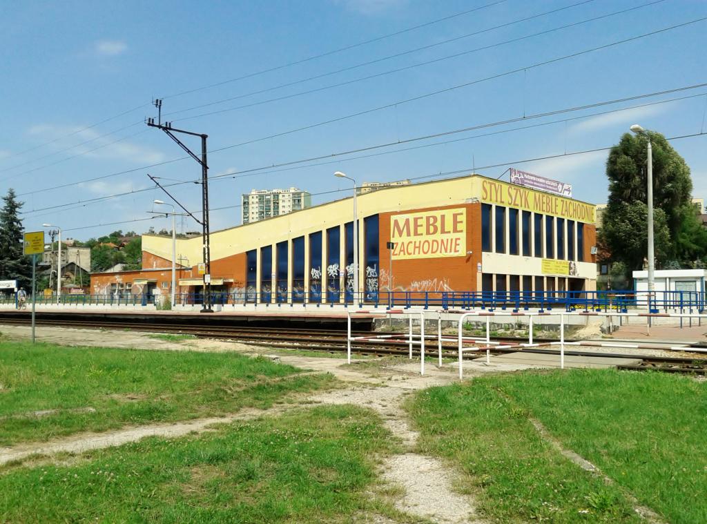 Dawny budynek dworcowy, lato 2014. Obecnie mieści się w nim sklep meblowy. Na pierwszym planie po prawej przejście przez torowisko, po lewej wejście na nieużywany peron 2. Widok od strony Zalewu Pasternik.