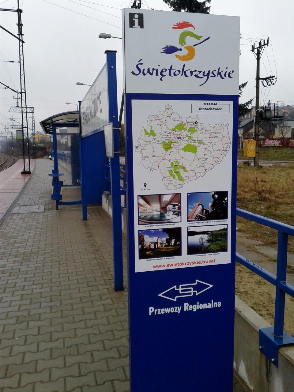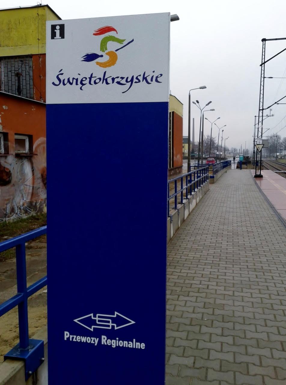 Słupek informacyjny promujący województwo świętokrzyskie na peronie 1.