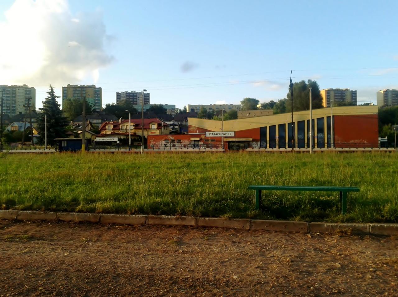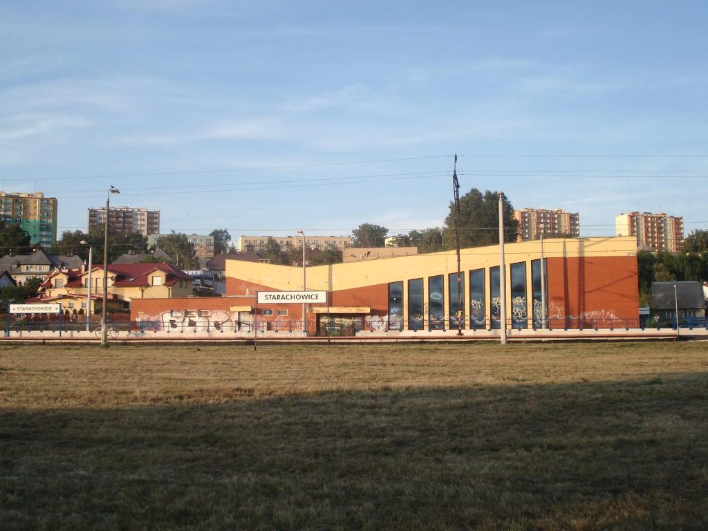 Budynek nieczynnego dworca PKP Starachowice. Na pierwszym planie widoczne przejście przez tory.