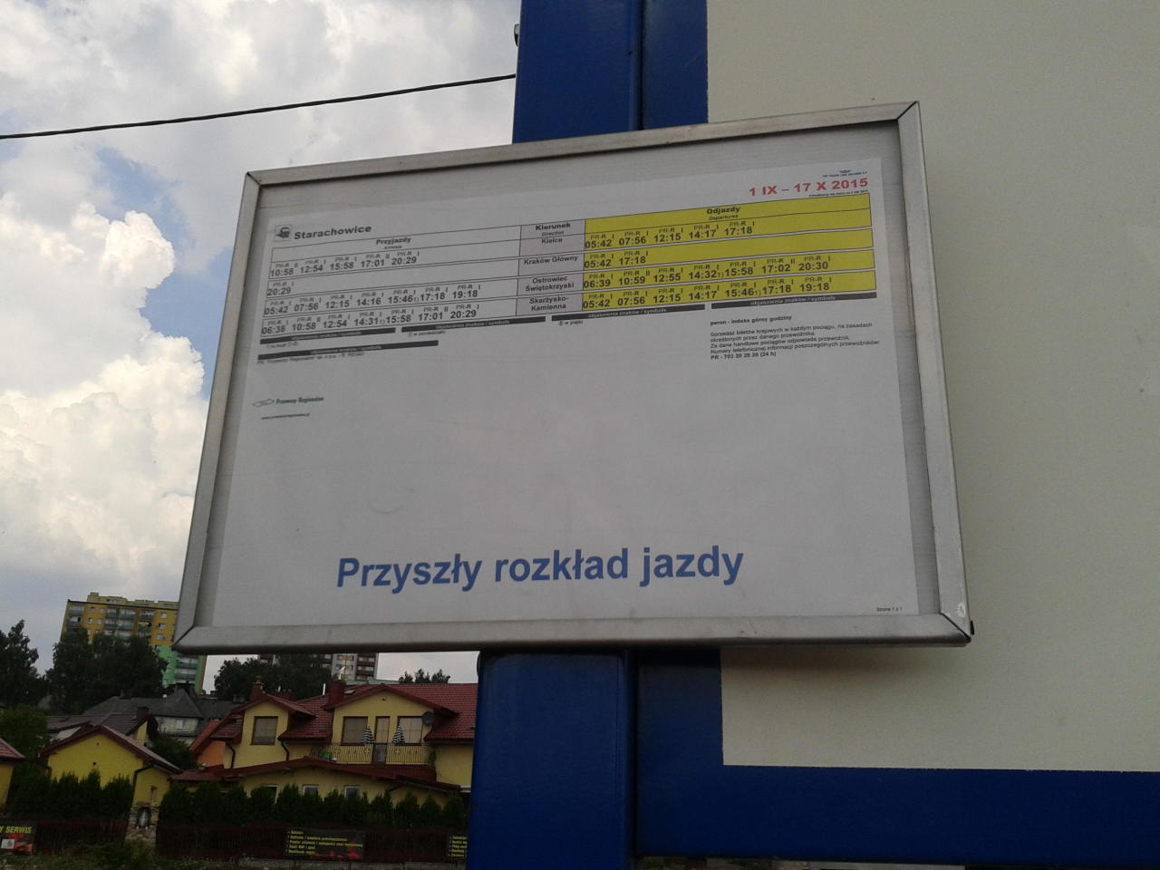 Rozkład jazdy znajdujący się obok wiaty przystankowej.