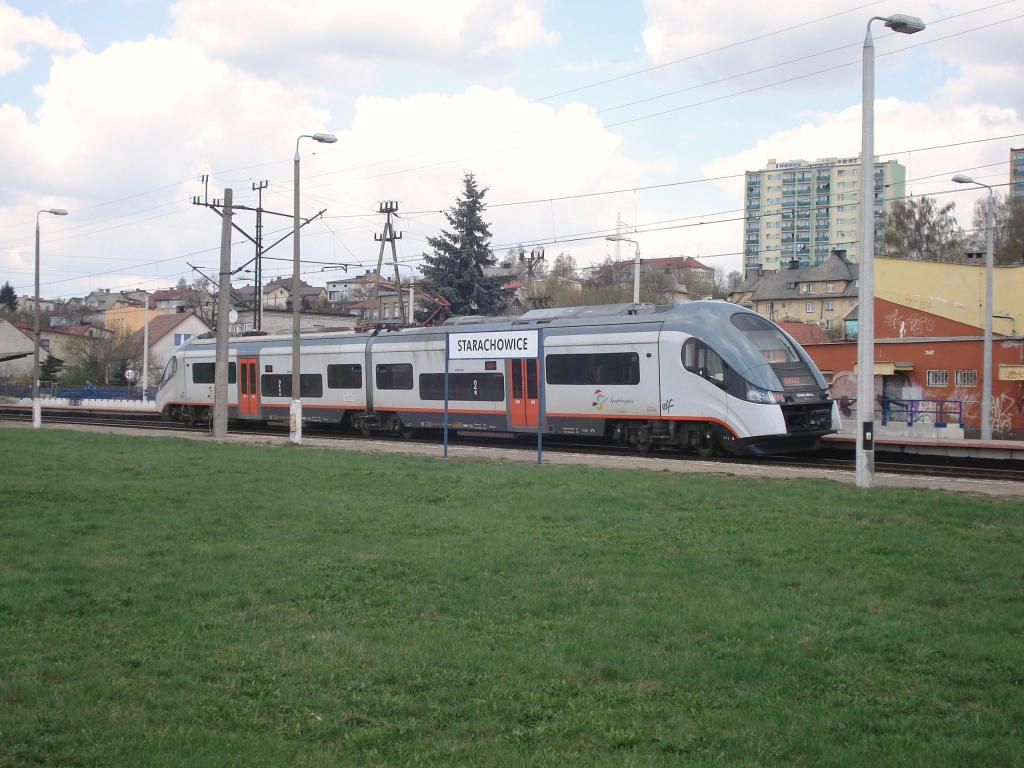 Szynobus z Ostrowca Świętokrzyskiego do Skarżyska-Kamiennej stojący przy nowym peronie na stacji Starachowice.