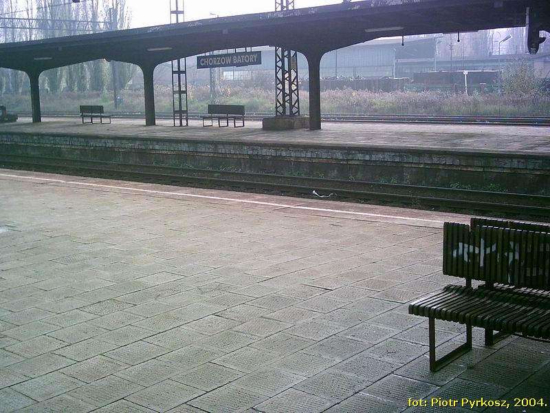 Stacja PKP Chorzów Batory. Peron 1 i budynek dworca (w tle). Widok w kierunku wschodnim, od strony wjazdów z Rudy Chebzie/Gliwic i Chorzowa Starego/Bytomia.