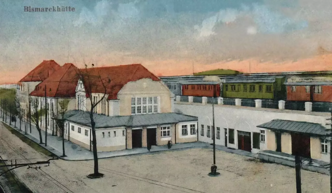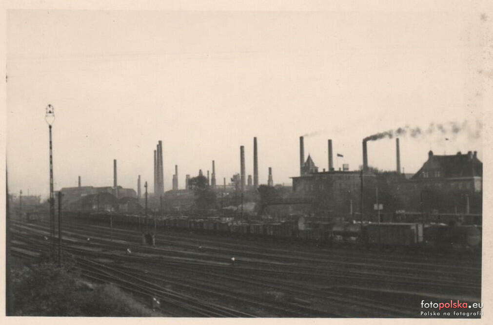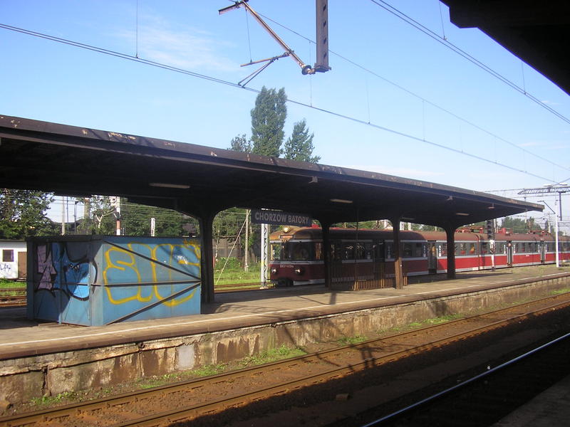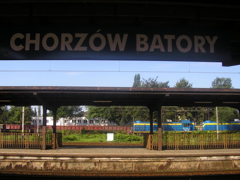 Stacja Chorzów Batory, zachodnia część. Za wagonami, po prawej stroni Zakłady Chemiczne "Hajduki", z lewej strony Huta "Batory". Widok w kierunku południowo-wschodnim; w lewo perony, w prawo Chorzów Stary/Bytom i Ruda Chebzie.