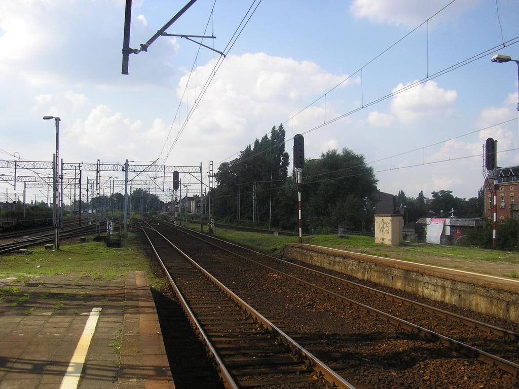 Stacja PKP Chorzów Batory. Początek peronów: z lewej 1, z prawej 2. Widok w kierunku południowo-wschodnim, od strony wjazdów z Rudy Chebzie/Gliwic i Chorzowa Starego/Bytomia.