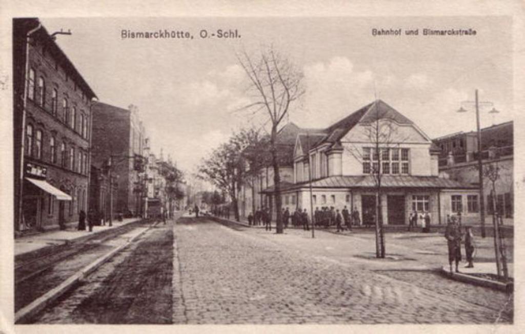 Stacja PKP Chorzów Batory. Budynek dworca od strony ulicy Armii Krajowej. Z prawej strony, na nasypie znajdują się perony.