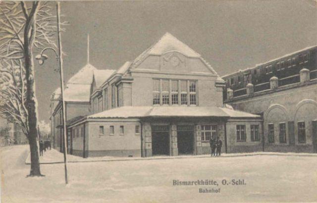Budynek dworca od strony dzisiejszej ul. Armii Krajowej. Z prawej strony, na nasypie znajdują się perony. Zimowa szata. Stara pocztówka.