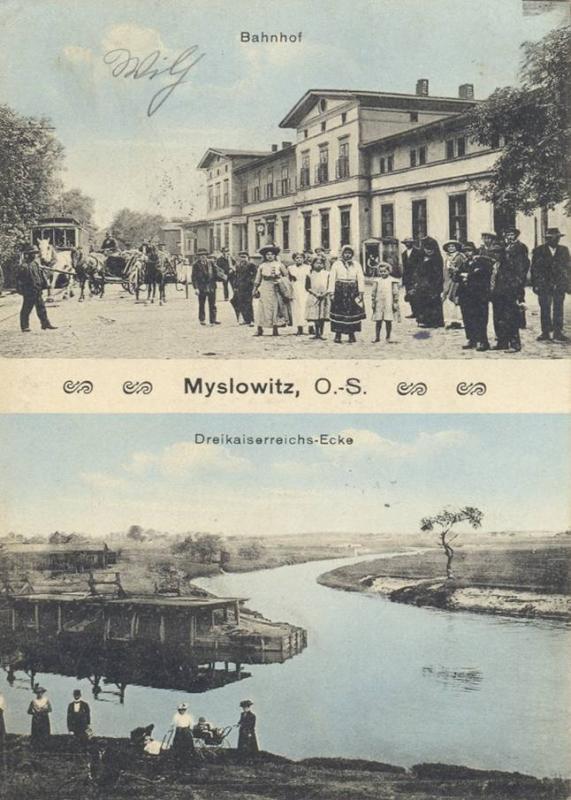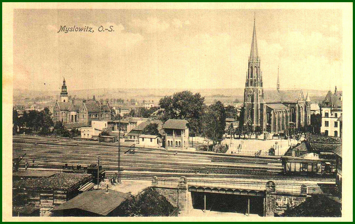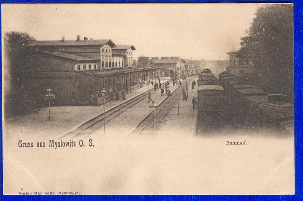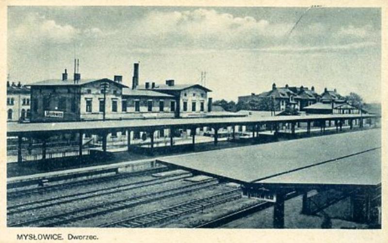 Stacja w Mysłowicach na dawnej pocztówce. Na wprost budynek dworca i perony. Widok w kierunku południowo-wschodnim, od strony wjazdów z Szabelni, Stawisk (dalej stacji Katowice, Katowic Janowa, Chorzowa Starego).