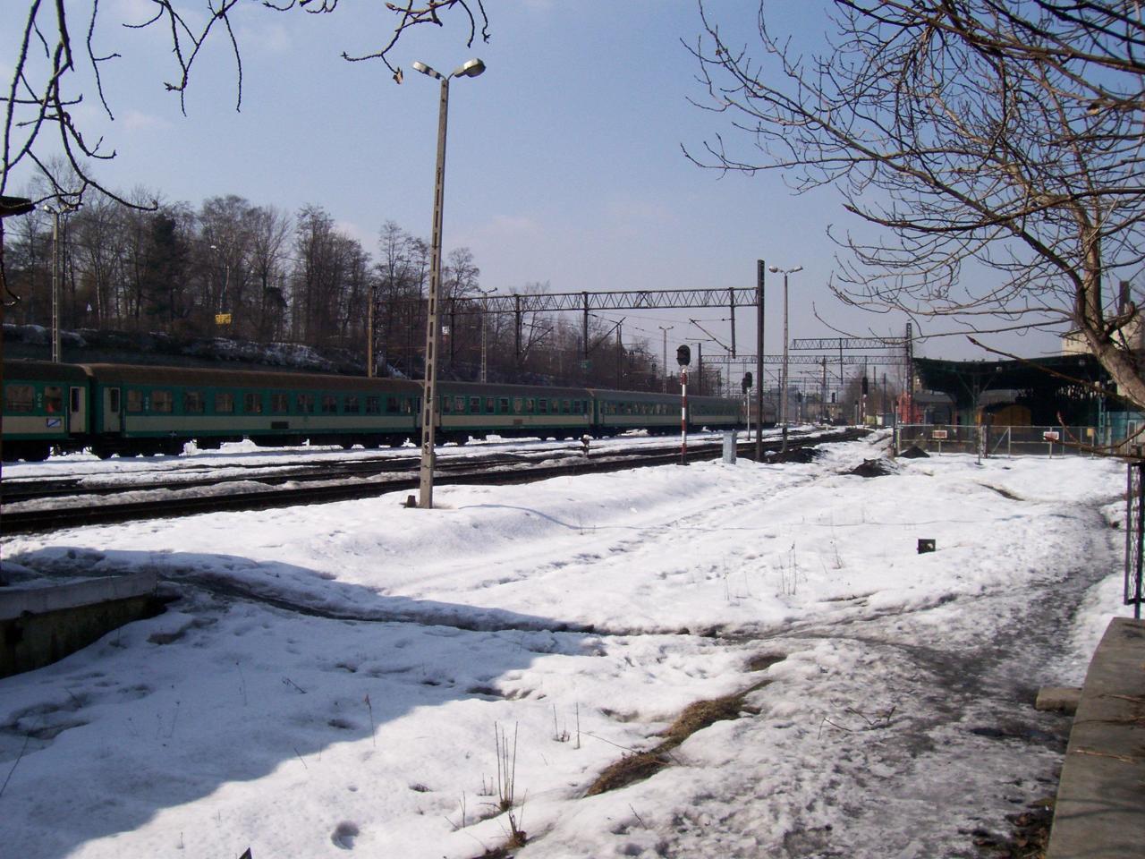 Perony, od prawej: 3, 2, 1 i budynek dworca. Widok w kierunku południowo-wschodnim: Mysłowice Kosztowy/Oświęcim, Jęzor/Jaworzno Szczakowa. Zdjęcie wykonane z ul. Oświęcimskiej.