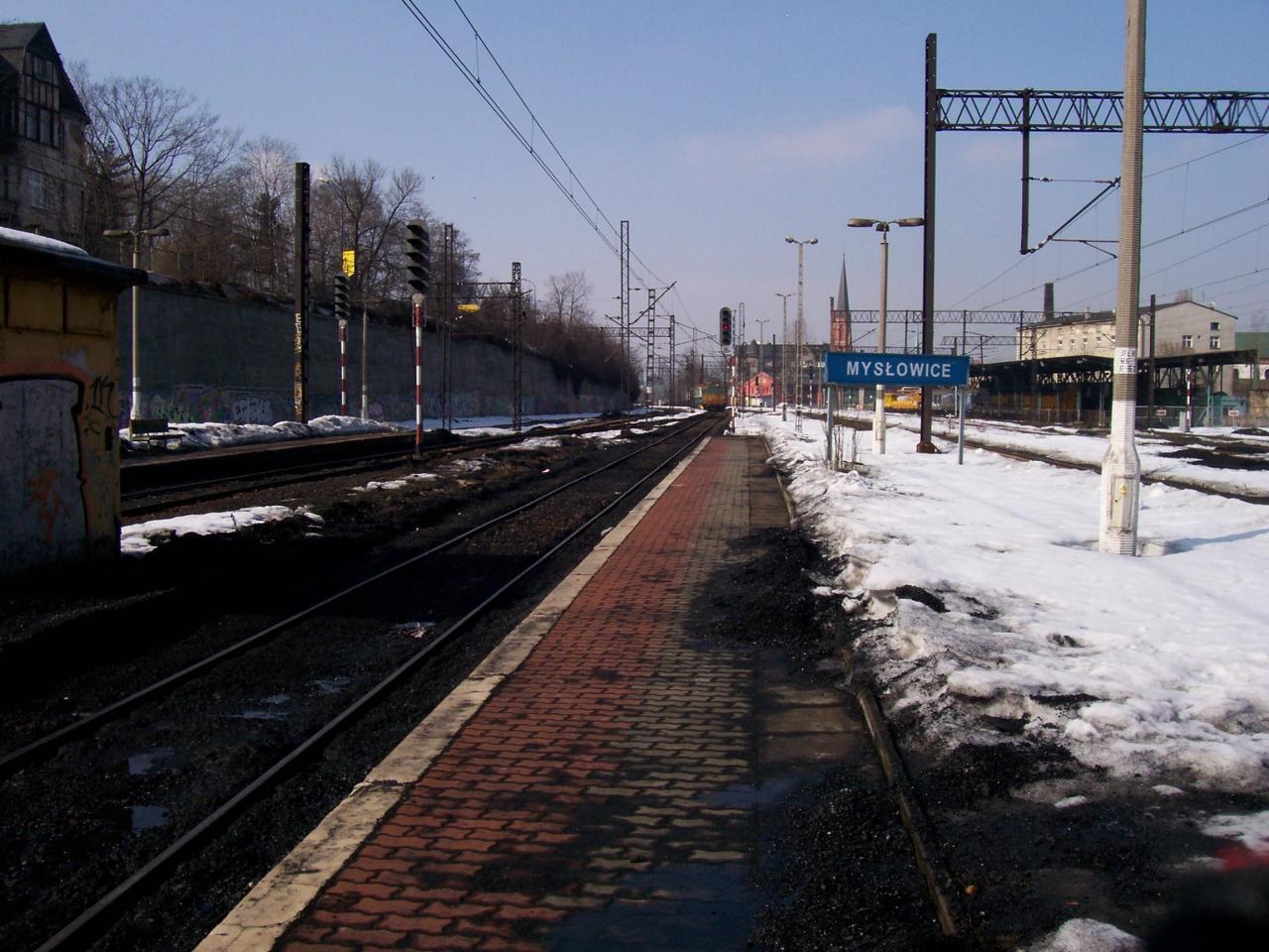 Stacja Mysłowice. Końcówka peronu 1. W tle lokomotywownia wachlarzowa stojąca przy ul. Powstańców. Widok w kierunku północno-zachodnim: Szabelnia, Stawiska (dalej stacja Katowice, Katowice Janów, Chorzów Stary).