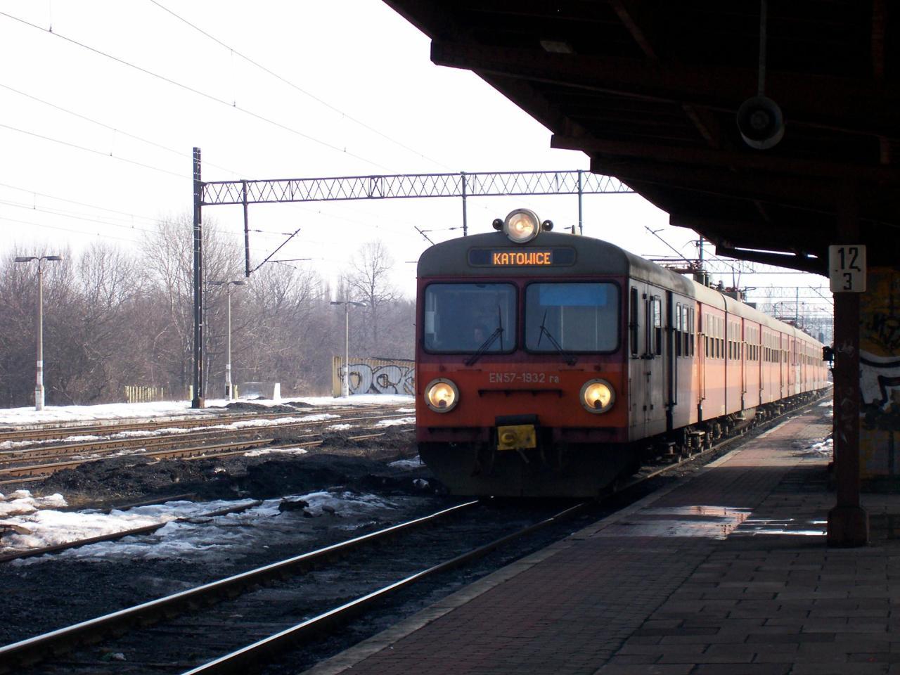 EN57-1932 stoi przy peronie 2. Z lewej peron 1. Widok w kierunku południowo-wschodnim: Mysłowice Kosztowy/Oświęcim, Jęzor/Jaworzno Szczakowa.