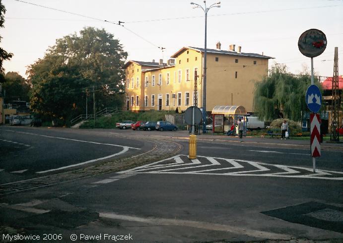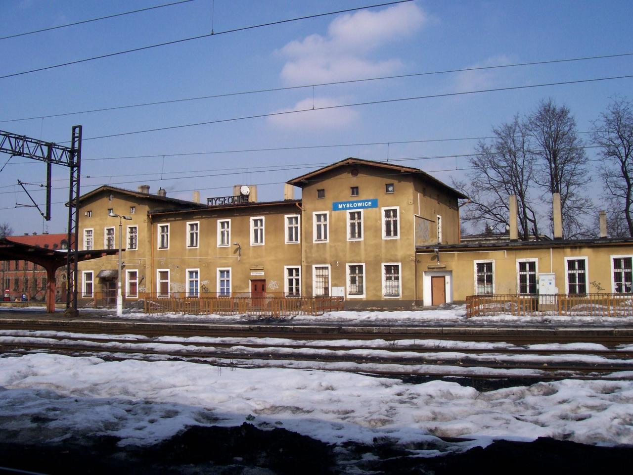 Zdjęcie stacji kolejowej w Mysłowicach, wykonane z ul. Katowickiej w kierunku południowo-wschodnim.