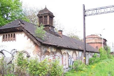 Opuszczone i niszczejące XIX-wieczne, zabytkowe budynki stacyjne w Mysłowicach, przy ul. Oświęcimskiej, opodal skrzyżowania z ul. Krakowską. W tle widoczna wieża wodna. Widok w kierunku północno-zachodnim: Szabelnia, Stawiska (dalej stacja Katowice, Katowice Janów, Chorzów Stary).